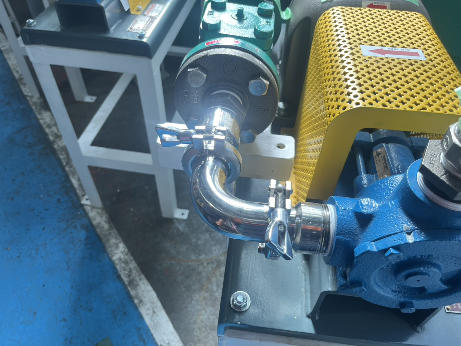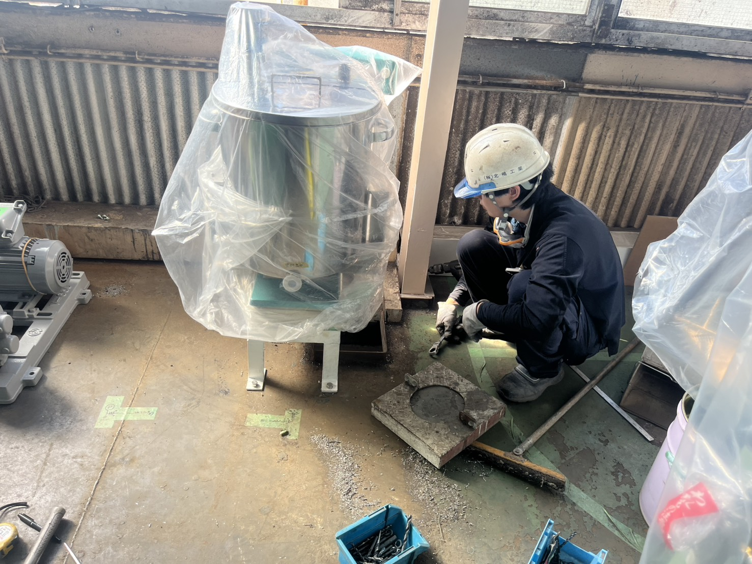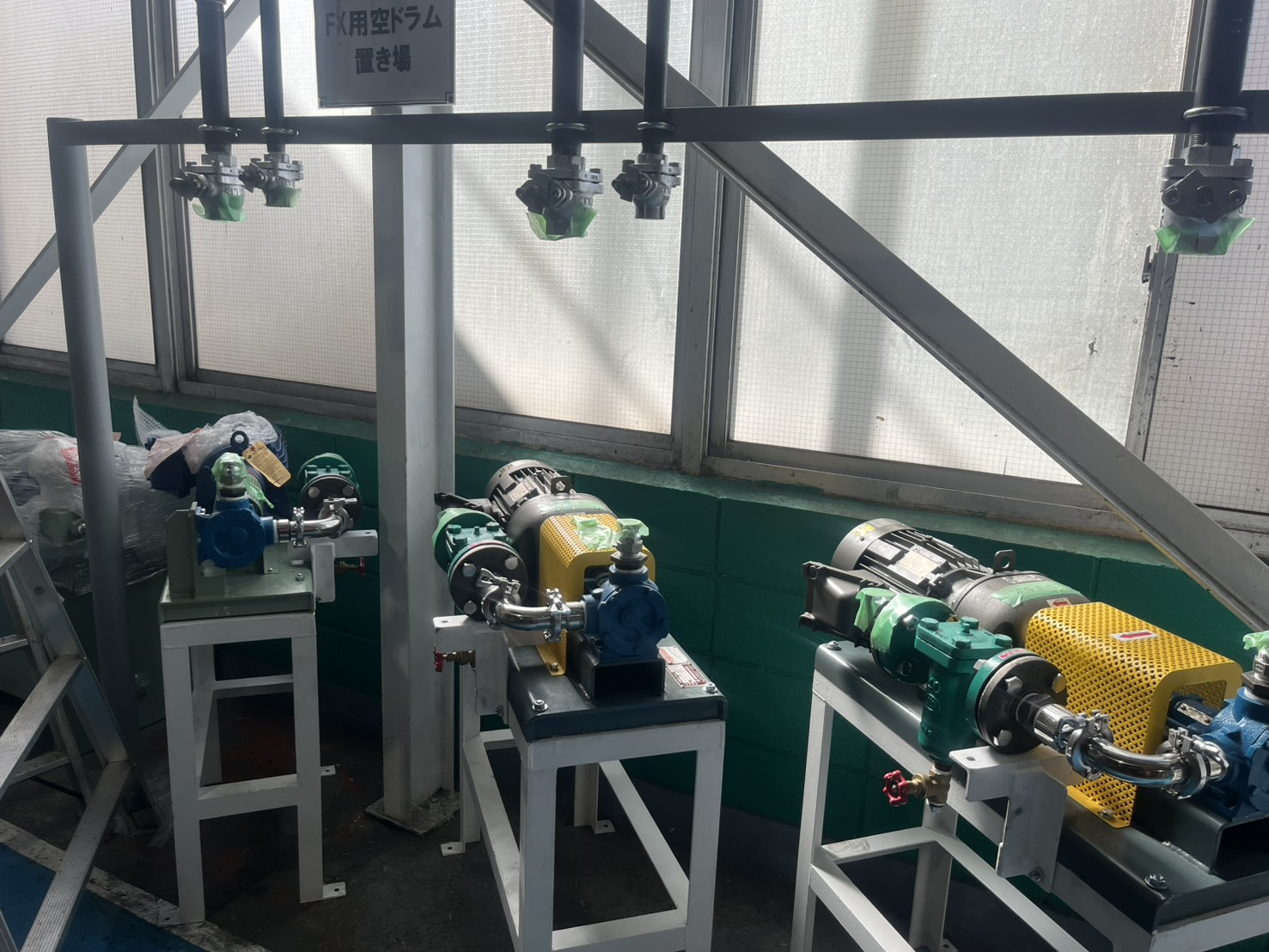 溶剤配管の製作・取付に加え、モーターポンプの設置工事を行ないました。 各設備の位置関係を確認しながら施工しています。